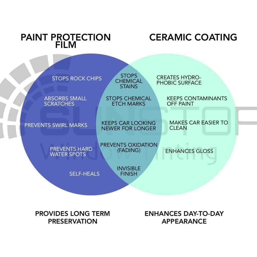 Paint Protection Film is thicker than Ceramic Coatings. Moreover, Paint Protection Film has a chemical composition that allows it to self-heal; that is, it returns to its original form after receiving an indentation or abrasion. These qualities make Paint Protection Film able to absorb rock chips, small scratches, swirl marks, and hard water spots without being permanently disfigured.